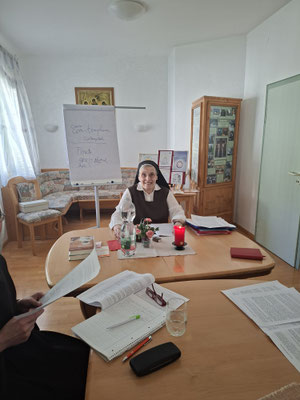Besonders bereichernd waren die täglichen Vorträge von Sr. Elisabeth Peeters, die aus ihrer persönlichen langjährigen Erfahrung im Karmel, sowie aus ihren zahlreichen Übersetzungsarbeiten schöpfte und uns mit viel Engagement, geistlicher Tiefe und Humor durch zentrale Themen der Spiritualität Teresa von Avila und Johannes vom Kreuz führte: Karmelspiritualität als Haltung und Beziehungsgeschehen statt Methode; was ist Kontemplation und Mystik? Ihre Vorträge luden nicht nur zum Zuhören, sondern auch zur persönlichen Reflexion ein und sind eine Bereicherung für unser weiteres Leben im Karmel.